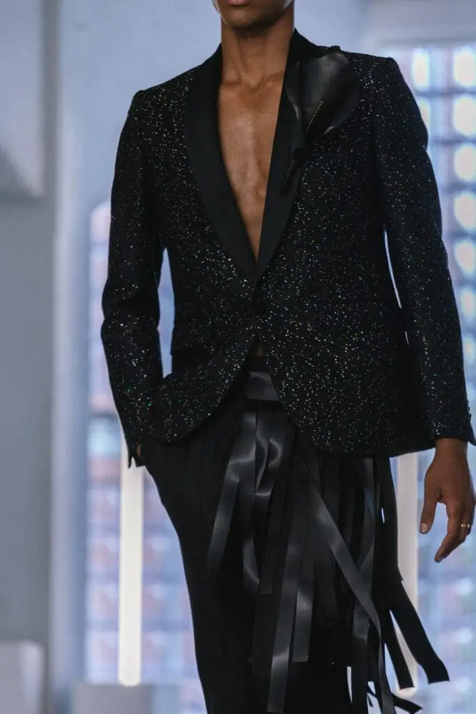 Titled “A Night in the Garden”, the collection unfolded in deep blacks and silvery textures, blurring the line between concealment and expression. Models moved through a minimalist space like apparitions, with fringed details, luminous surfaces, and sculptural silhouettes evoking the stillness of a moonlit garden—quiet, exacting, magnetic.