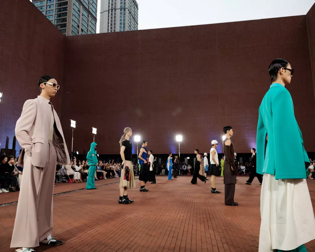 As the models glided down the runway, their silhouettes seemed to echo the architecture surrounding them. The muted palette of the early looks lent a sense of serenity, their structured lines reminiscent of modernist design principles. The garments, however, did not simply rest on the body — they moved with it, accentuating the natural flow of movement. This careful attention to both form and fluidity created a dynamic tension, much like the relationship between structure and space in architecture. There was a quiet power in these designs, as though they were inviting the audience to consider the nuances of restraint and understatement.