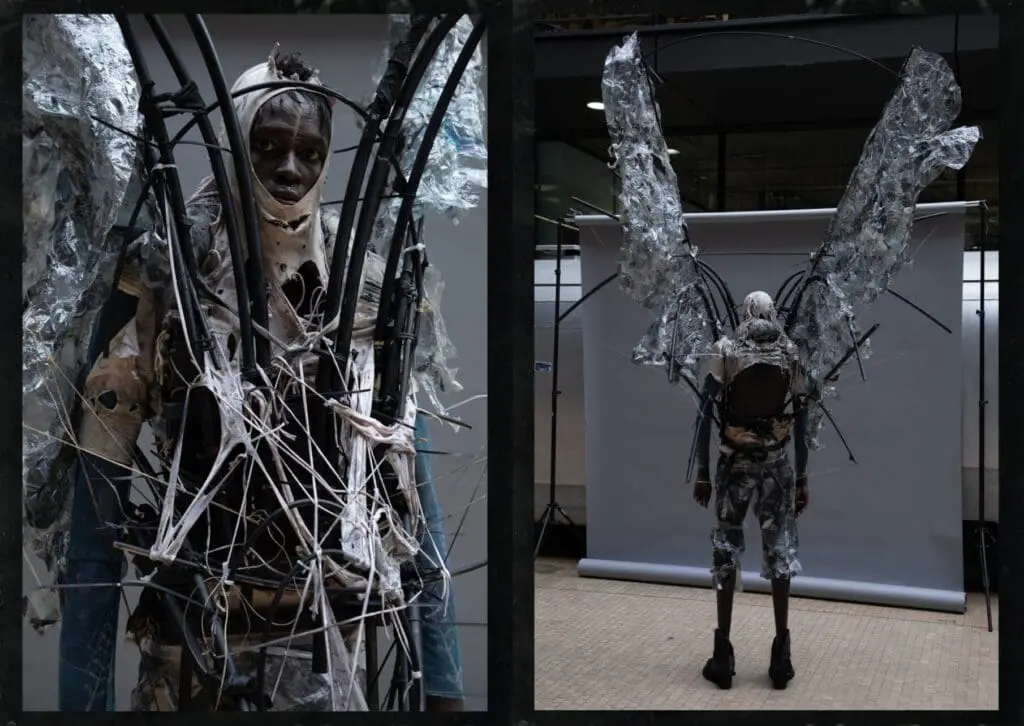 They burst onto the scene with their 2024 CSM BA collection Seven Sisters, a homage to community and resilience. Using sustainable practices like cotton jersey dyeing and a futuristic blend of lacing, eel parts, circuit board wires and found objects, Yodea moulded sculptural ensembles and arcing wing-like forms that sprouted from the models’ skin — evoking visceral and organic interconnection.